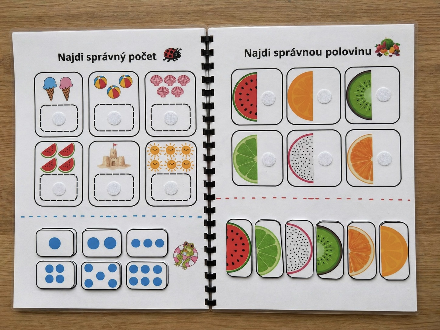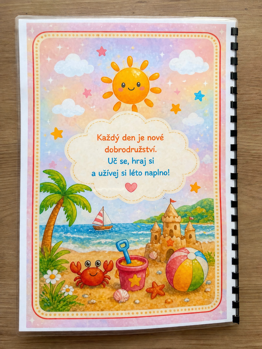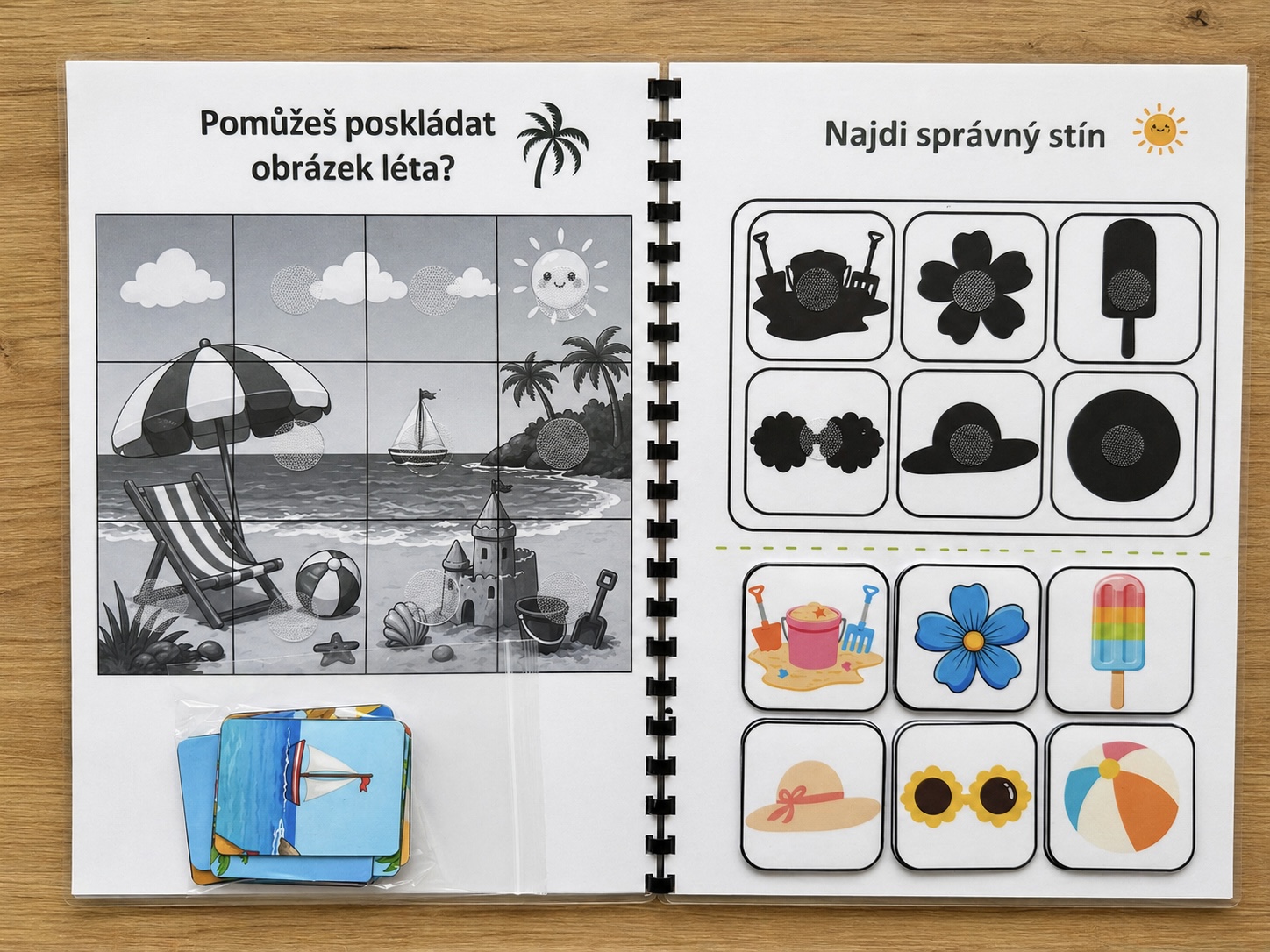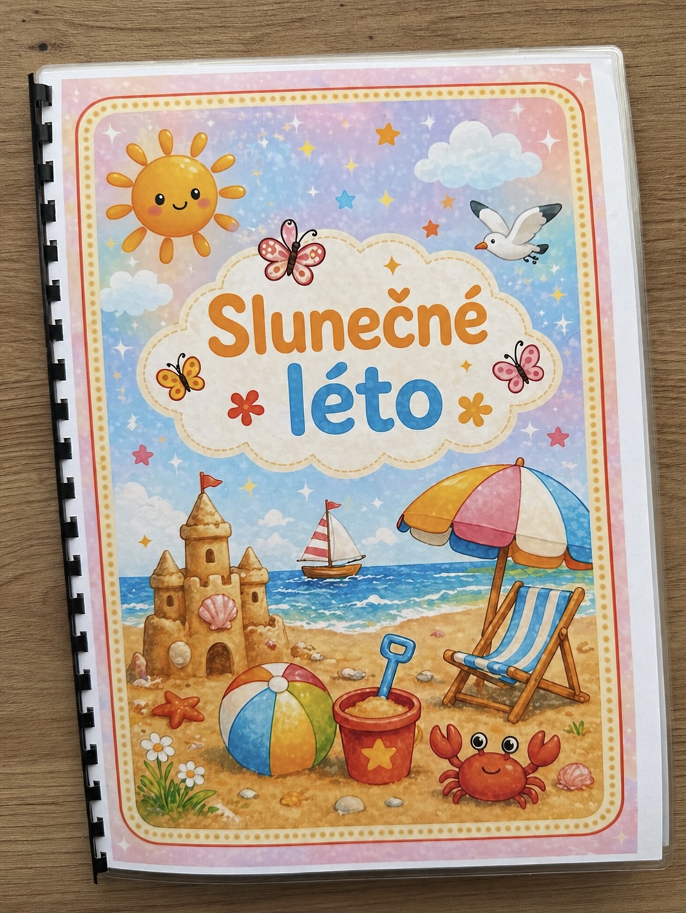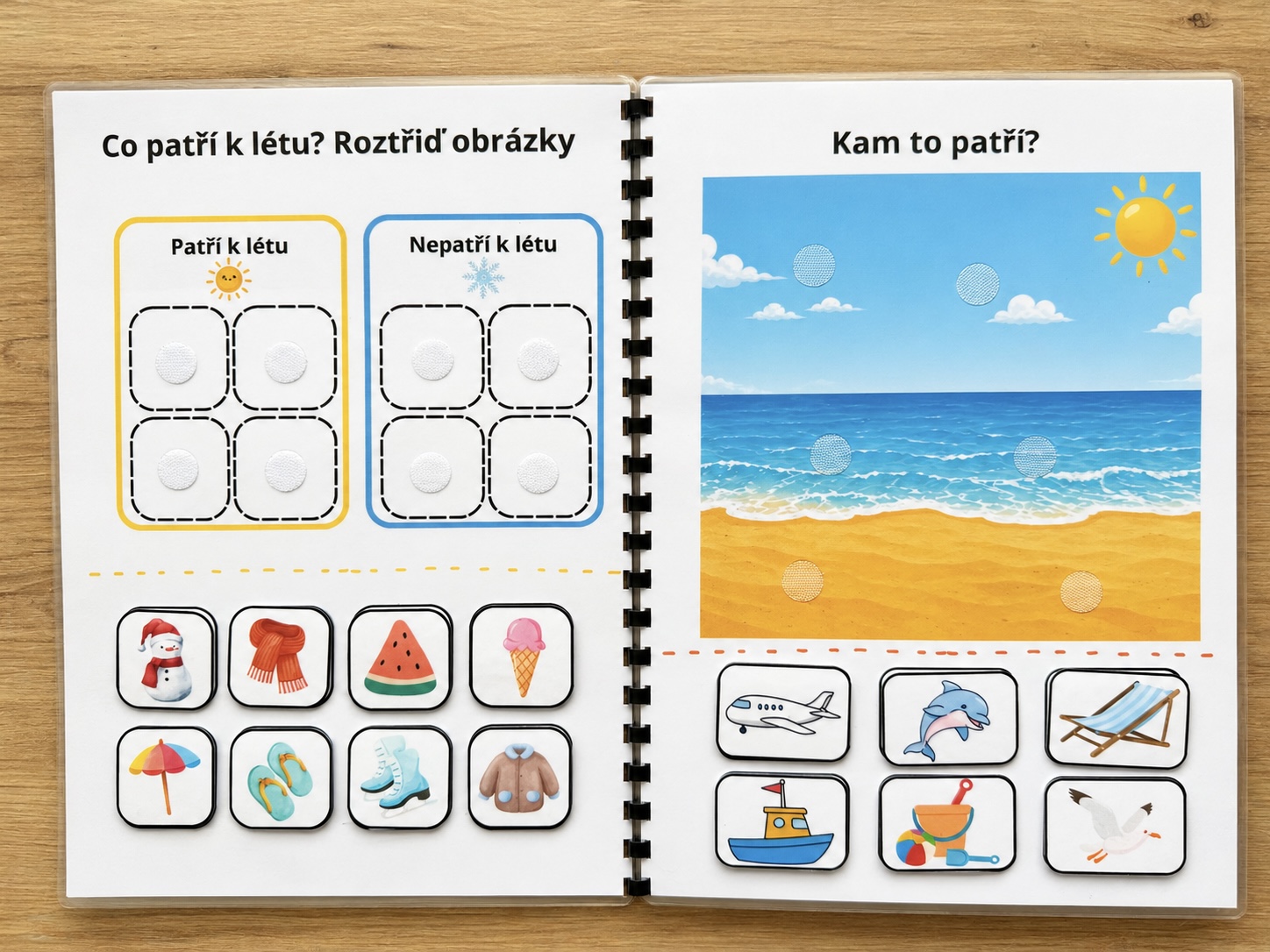 Letní pracovní sešit na suchý zip pro děti 2–4 roky. 6 hravých úkolů rozvíjí motoriku, logiku i vnímání. Zábavné učení hrou doma i na cestách.