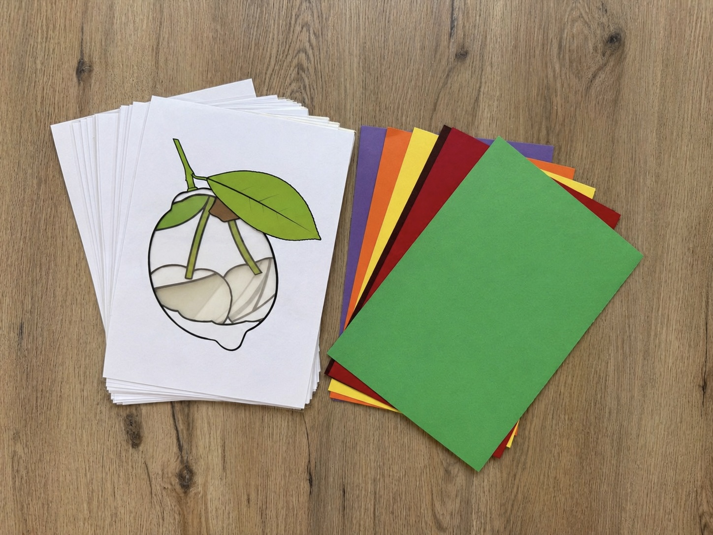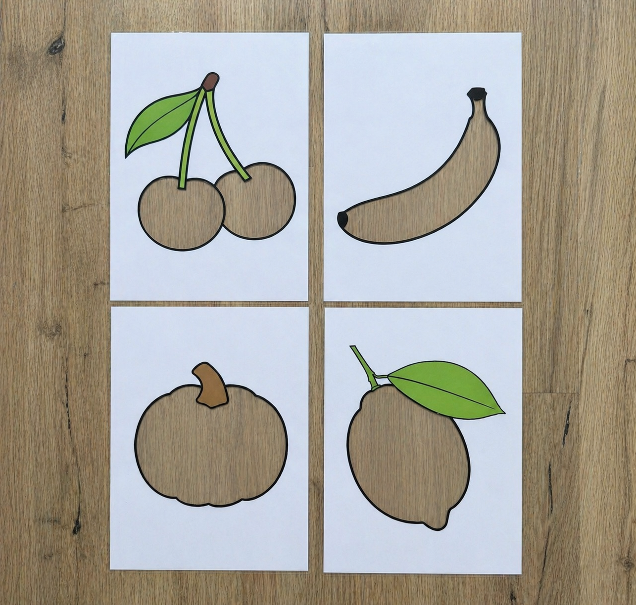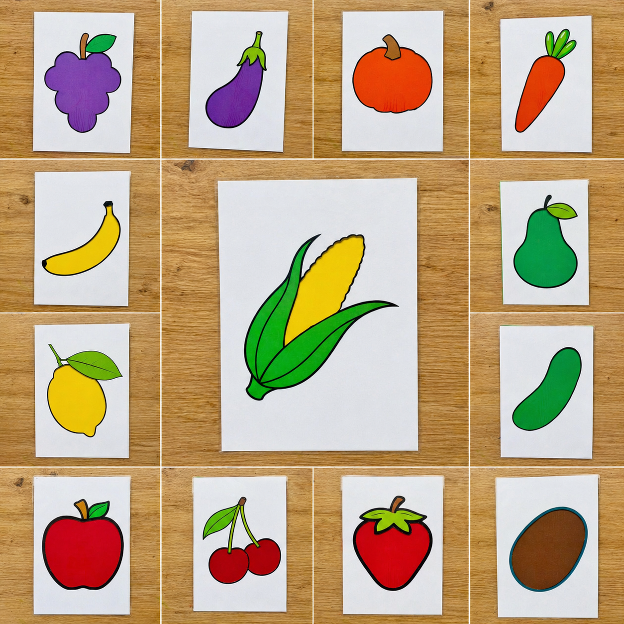 Varianta s podklady Sada obsahuje 16 zalaminovaných kartiček (A4) ovoce a zeleniny + 7ks tvrdé barevné podkladové papíry pro přiřazování.