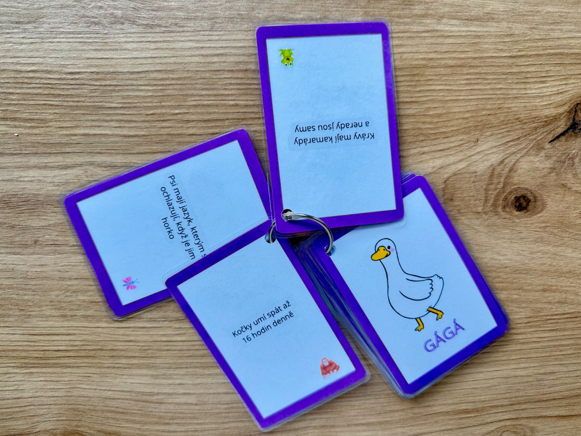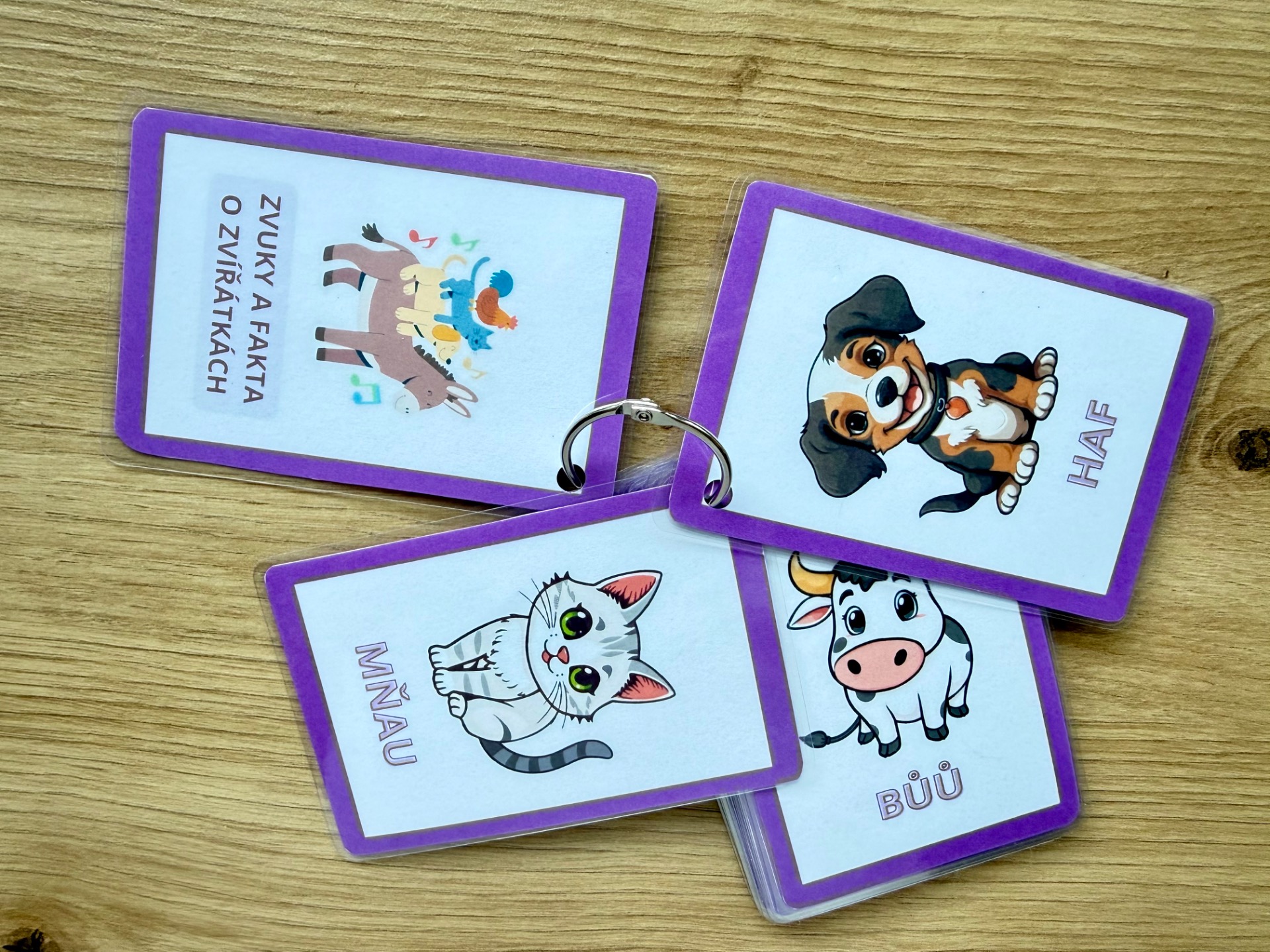 Sada 15 laminovaných kartiček pro malé děti. Na přední straně obrázek + zvuk zvířete, na zadní krátká zajímavost.